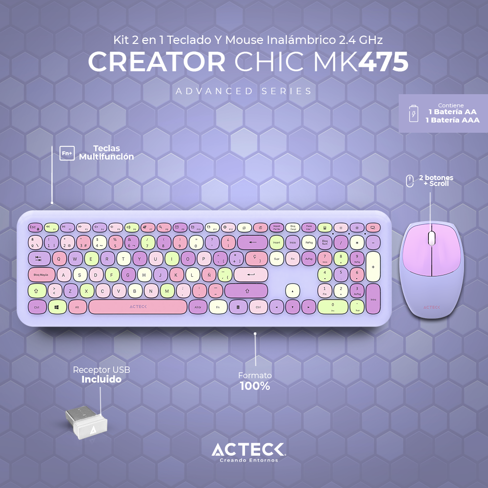 Kit Teclado Y Mouse Acteck Creator Chic Colors Mk475 Inalambrico, Usb, Negro